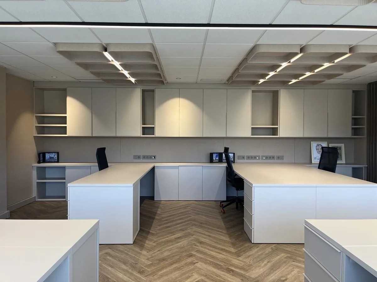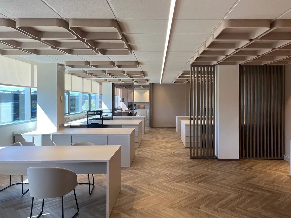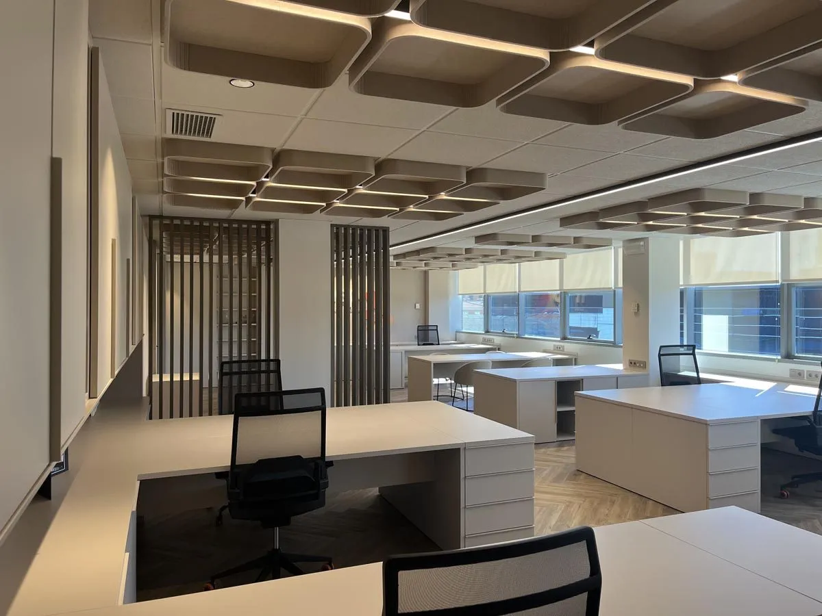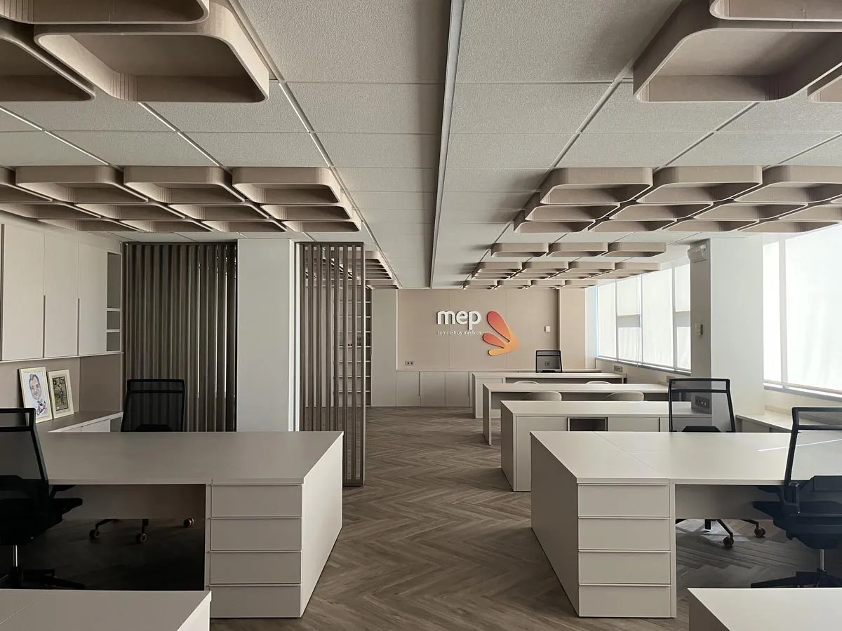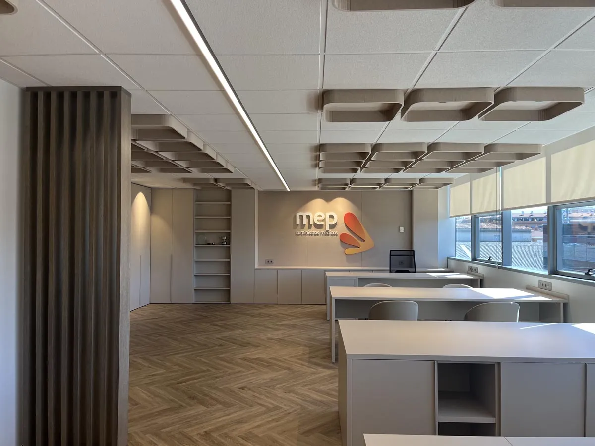Diseño y fabricación de todo el mobiliario a medida: armarios, mesas, cajoneras, estanterías y separadores de ambiente para unas oficinas de distribución y comercialización de suministros médicos en Ansoáin, Pamplona.
