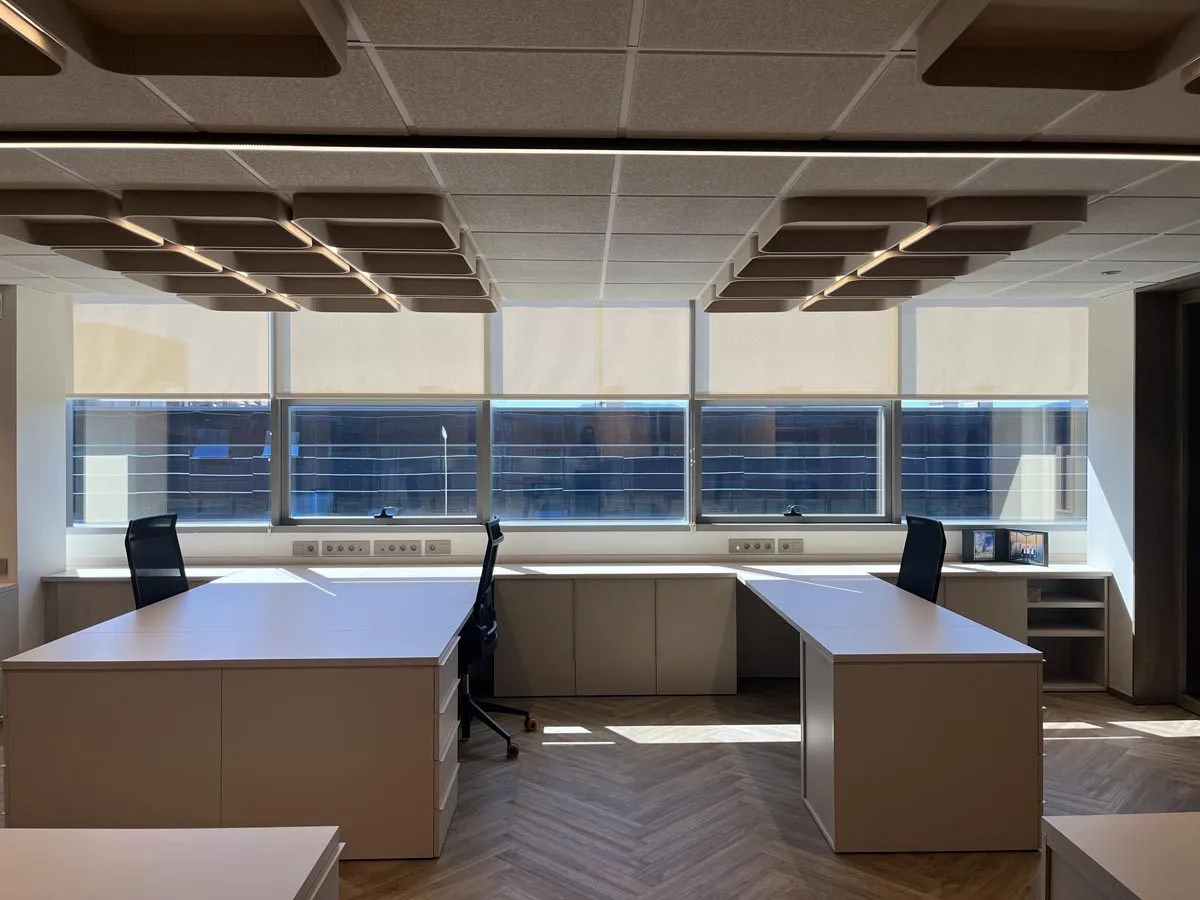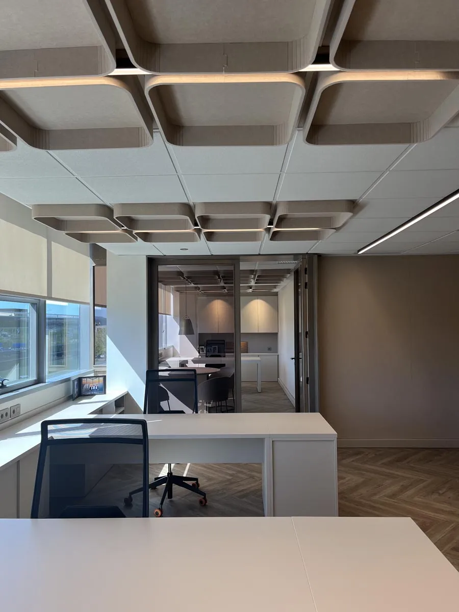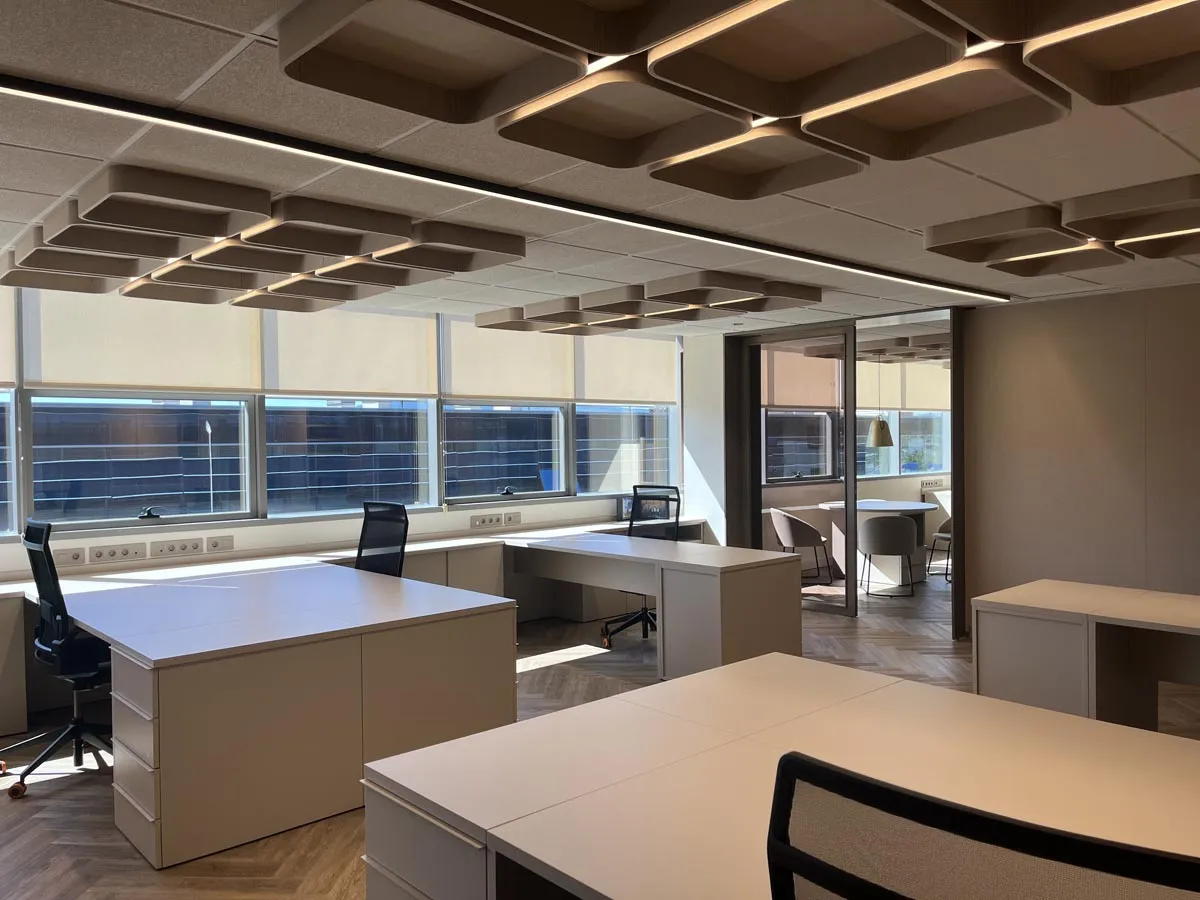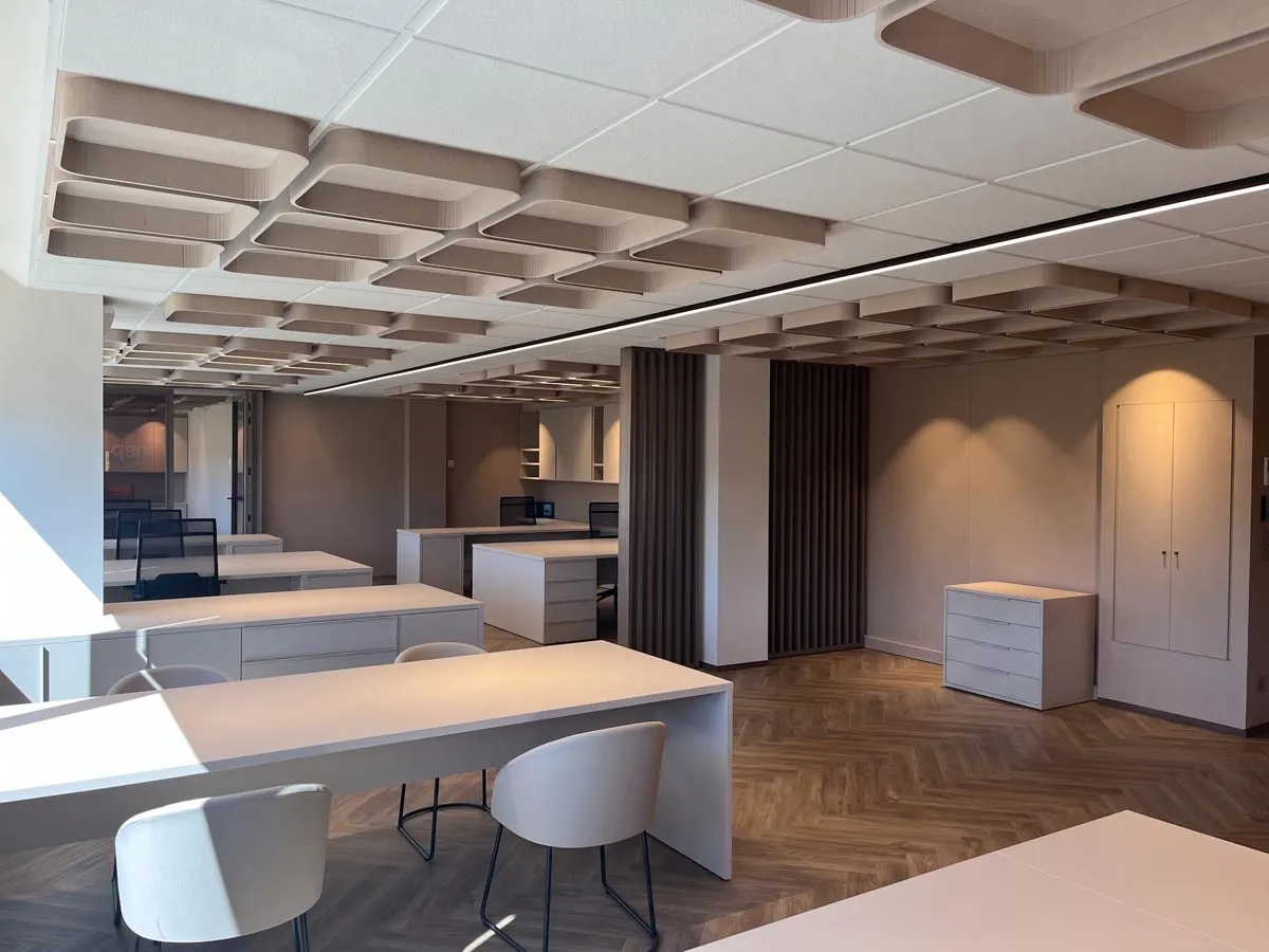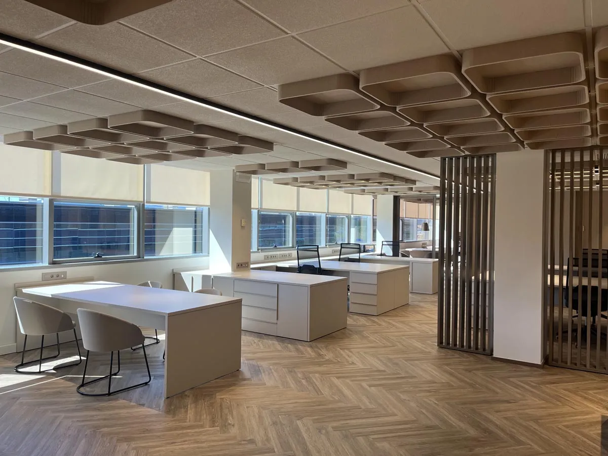 Diseño y fabricación de todo el mobiliario a medida: armarios, mesas, cajoneras, estanterías y separadores de ambiente para unas oficinas de distribución y comercialización de suministros médicos en Ansoáin, Pamplona.